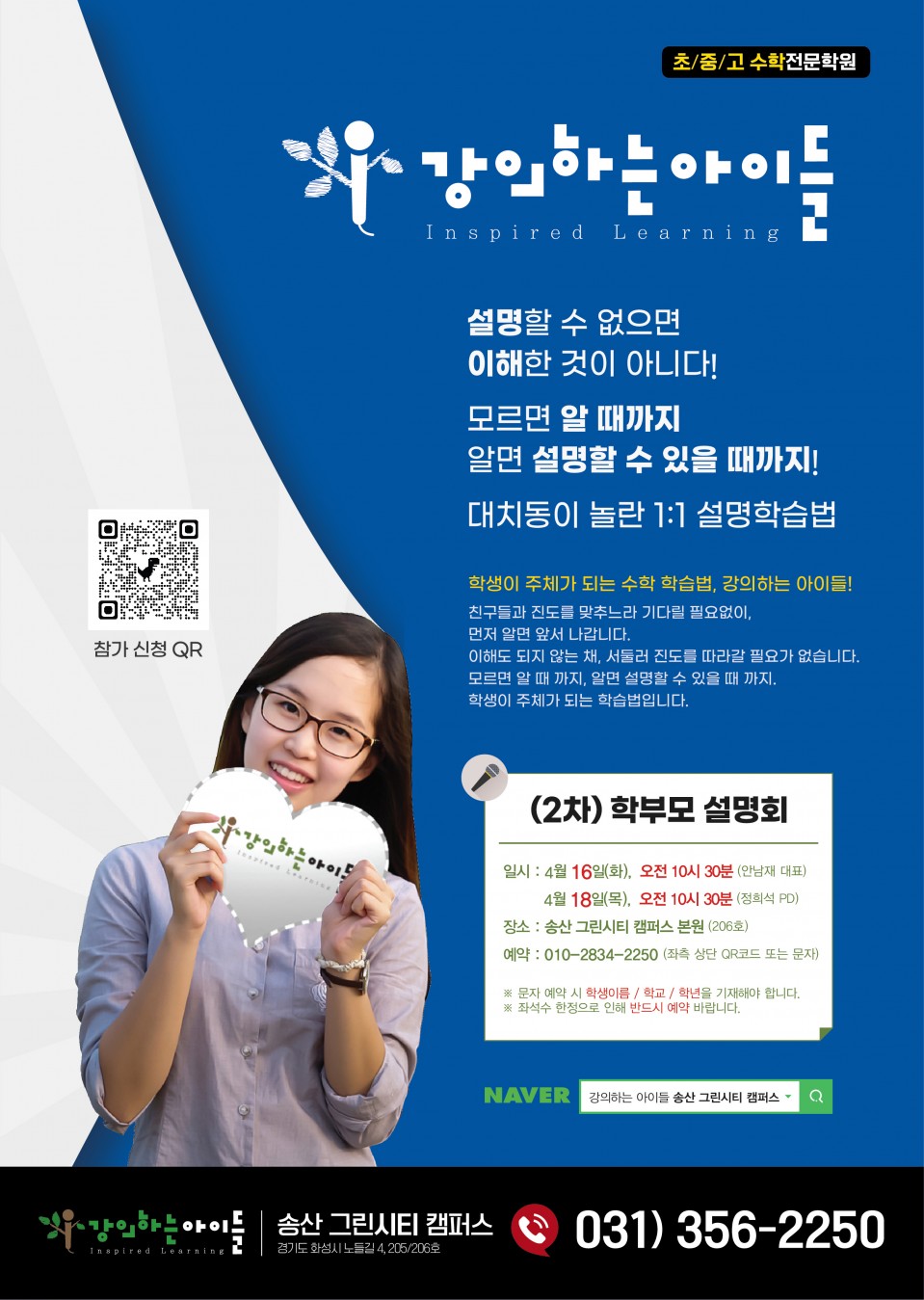 안녕하세요? 강의하는아이들 송산그린시티 캠퍼스입니다. 작년 8월에 많은 관심과 참여를 해 주셔서 감사드립니다. 이번 4월에 2차 학부모 설명회를 개최하고자 하오니 관심 있으신 학부모님들의 많은 참여 부탁드립니다.